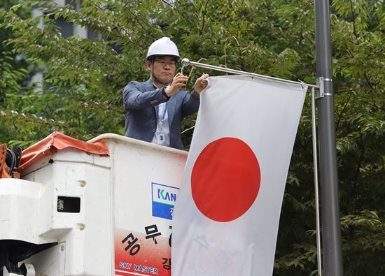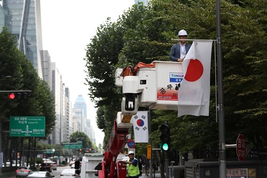 江南区庁は同日午後2時から、テヘラン路、永東大路、ロデオ通り一帯に掲げられた日本国旗を撤去する予定だと明らかにした。サムスン駅の交差点から江南駅まで、テヘラン路3.6キロ区間には、外国の国旗137旗のうち、日本国旗が7旗がある。
